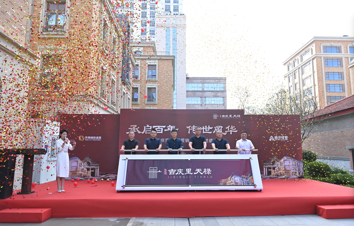 在激动人心的开放盛典启动仪式上,济南泉城城市更新投资有限公司董事长王宇靖先生,济南商埠城市更新有限公司总经理赵艺先生,远洋集团济南公司总经理刘晓先生、副总经理马磊先生、副总经理张海冬先生共同登台,在倒计时中推动启动杆,展开象征时代续写的卷轴,标志着1904吉庆里·天禄营销中心正式启幕。