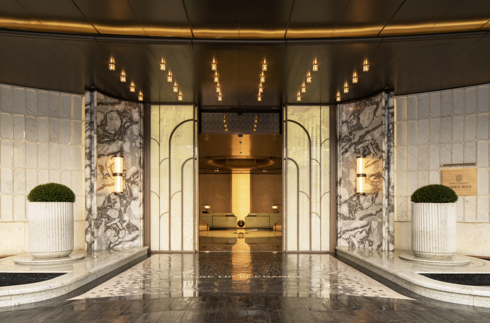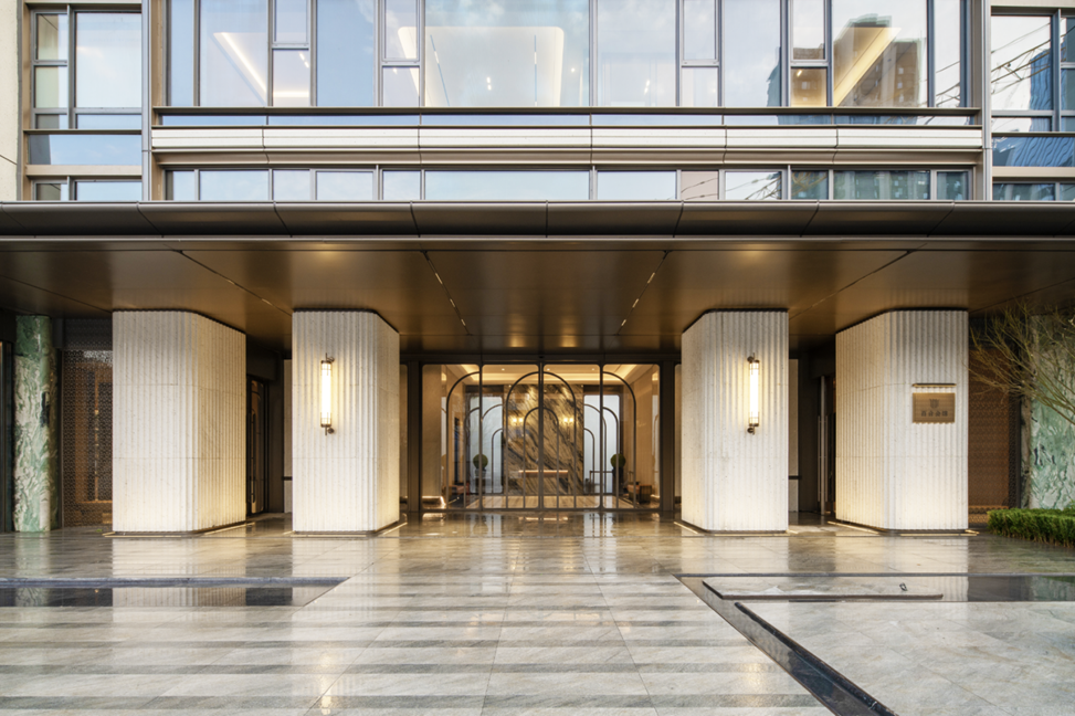 本次开放的全维实景示范区,屹立于“双首层绿洲”错落基底上,PLUS级“蓝宝石”玻璃与香槟金、仿白金铝板相映,施以精湛工艺,构筑璀璨CBD的隽永立面。汲取上海外滩华尔道夫酒店灵感,约210块巴西白金石景墙与透光云石大门静立,2棵冠幅约4米百年老桩石榴对列迎宾,地面以库班绿、云黑石铜雕铺陈,共同启幕高奢酒店式门仪。