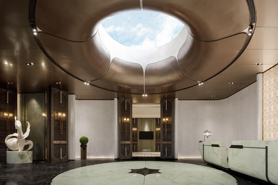 百合前厅,青玉地面与百合天窗互映,奢华大堂书页形墙面,搭配百合定制琉璃壁灯,冷暖光辉映,可谓腔调十足。