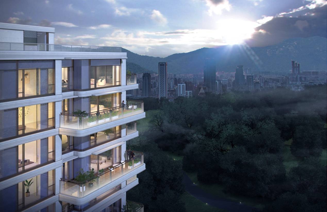 立面材质:为融合自然环境,打造人与自然共生的立面美学,项目在立面打造上,采用玻璃幕墙+大面积铝板,玻璃幕墙配置宽幕超白玻璃,通过简约的线条设计,最大化保证观景面,实现“户户观山”的居住体验。